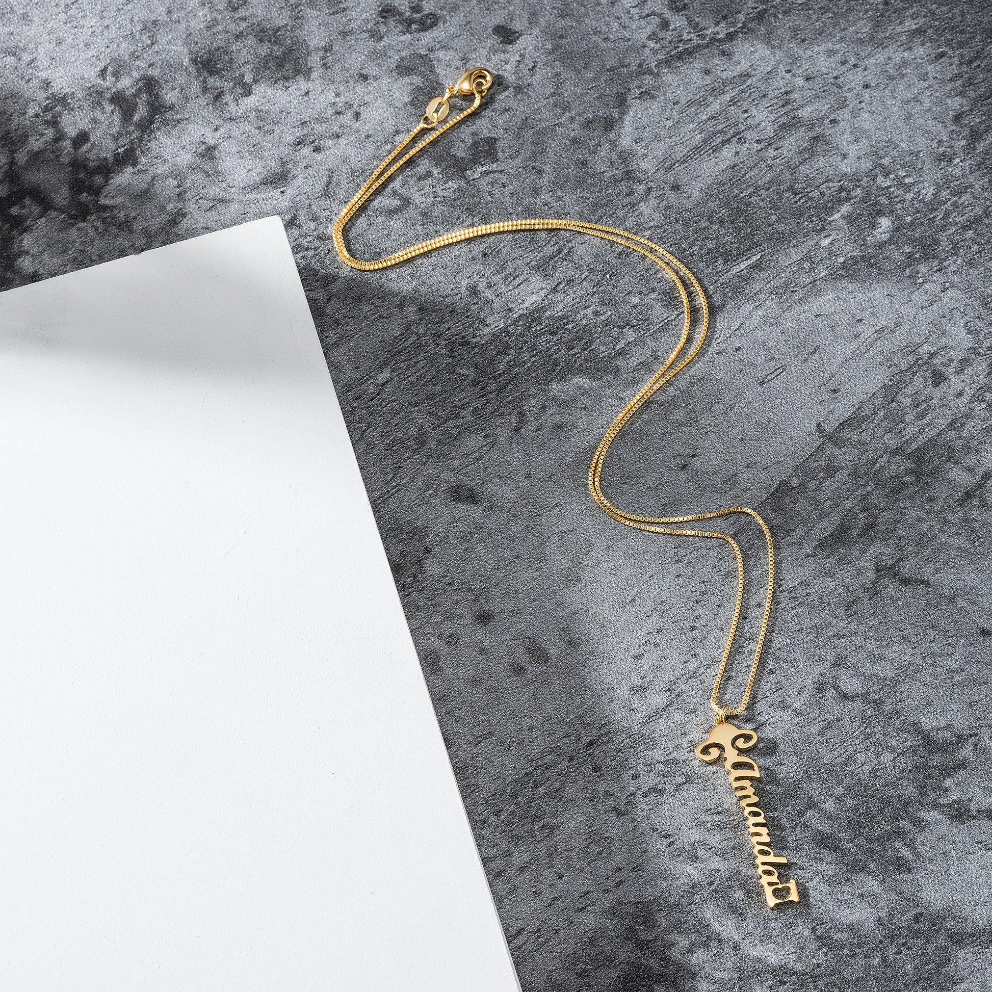 - The pendant features a classic vertical custom name design, adding a touch of elegance and simplicity to any outfit.